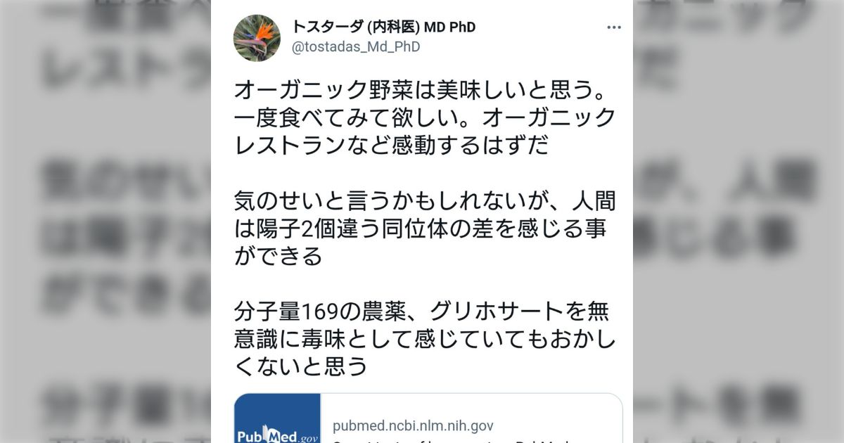 次に反ワクチン・反農薬(特にグリホサート)の持論を展開している医師を名乗るアカウントです。ここでは「トスの人」と呼びましょう。どんな主張をしているかは以下のまとめで雰囲気をつかめることでしょう。