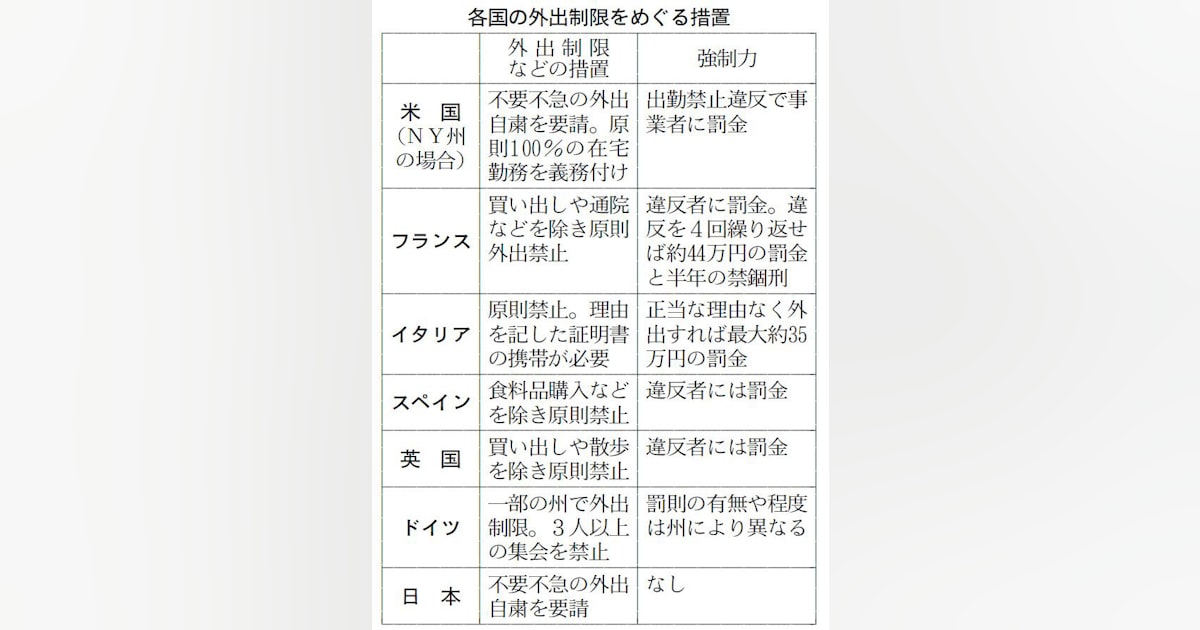 日本経済新聞:欧米は私権制限 外出禁止に罰則、日本と強制力で違い