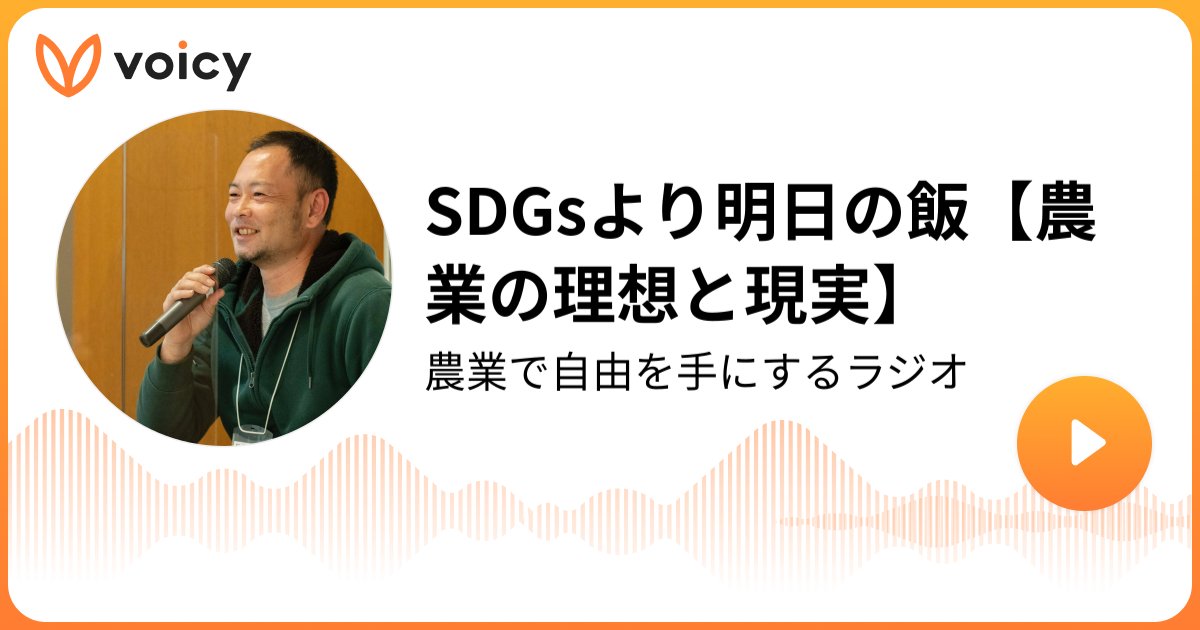 生産現場の視点においては環境問題に対応する余裕がなかなかないということを先ほど書きましたが、その視点で参考になる情報がありました。Voicyという音声配信プラットフォーム(YouTubeの音声だけ版のようなもの)で、農家の方が発信を続けているチャンネルがあります。